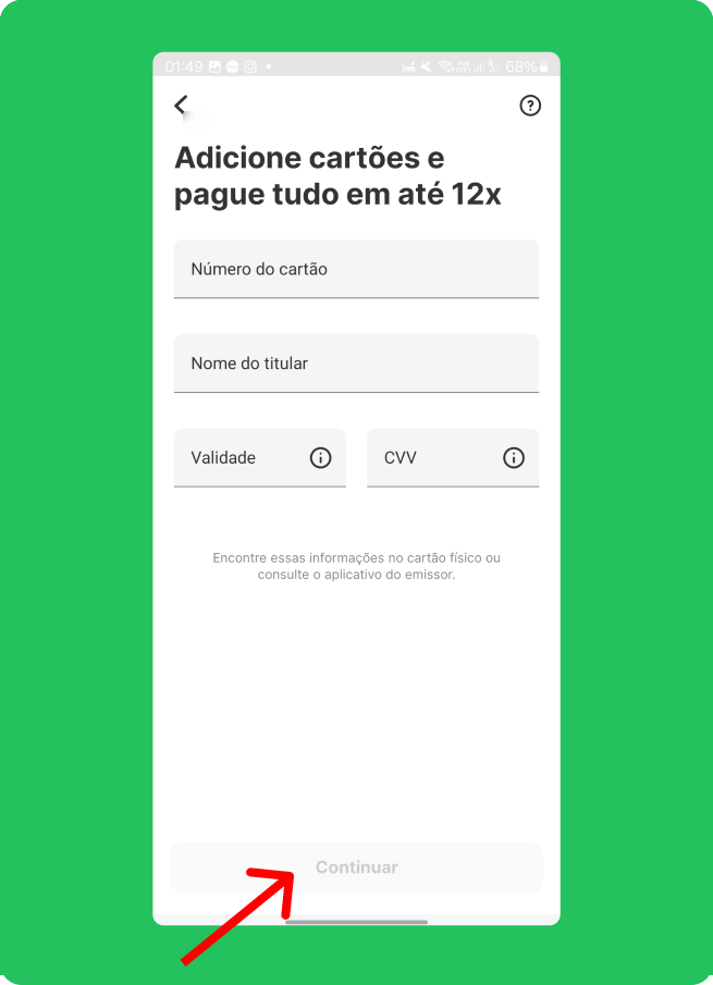 Preencha os dados do cartão que deseja usar e clique em "Continuar" para realizar o pagamento.
